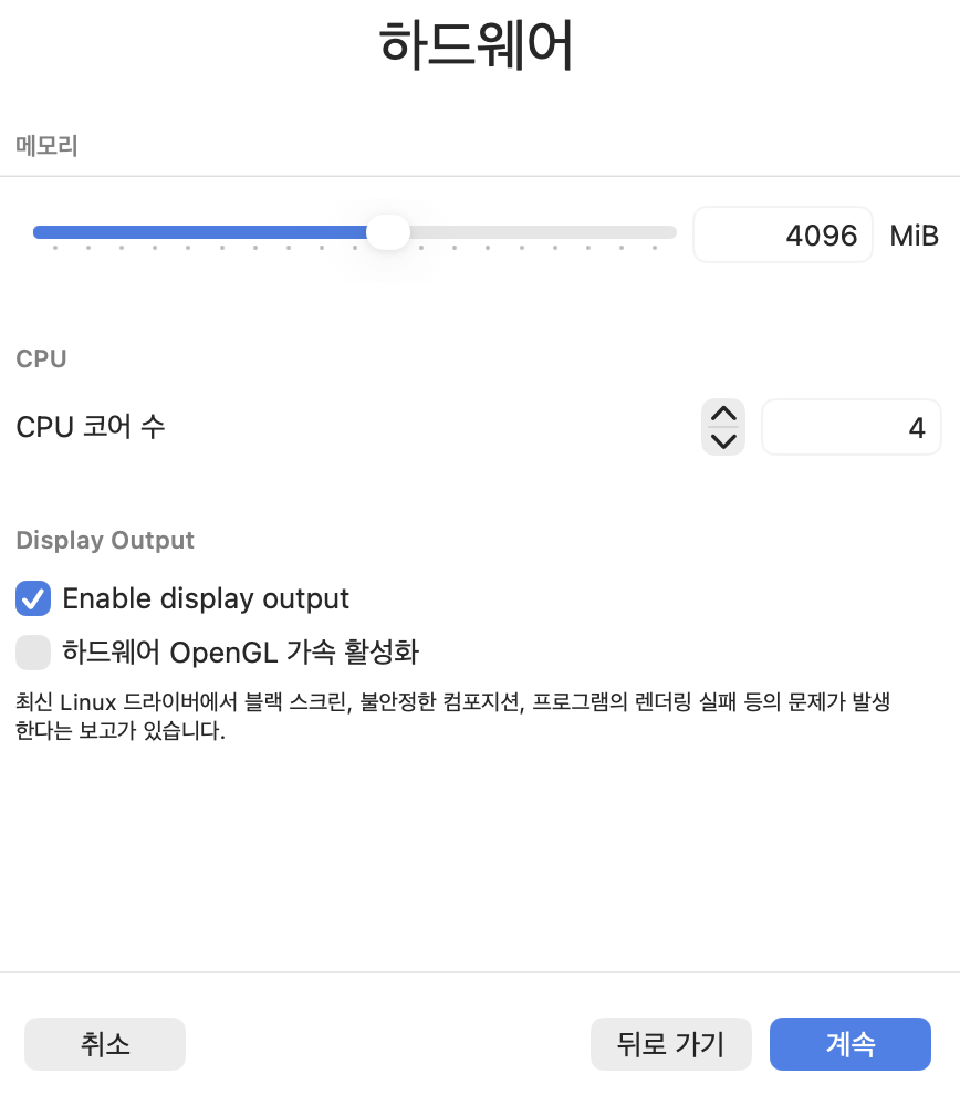 여기 실정은 나중에 바꿀 수 있어서 적당히 4gb 에 4코어 정도 줬다 더 필요하면 추가하고 남아돌면 나중에 줄여주면 된다.